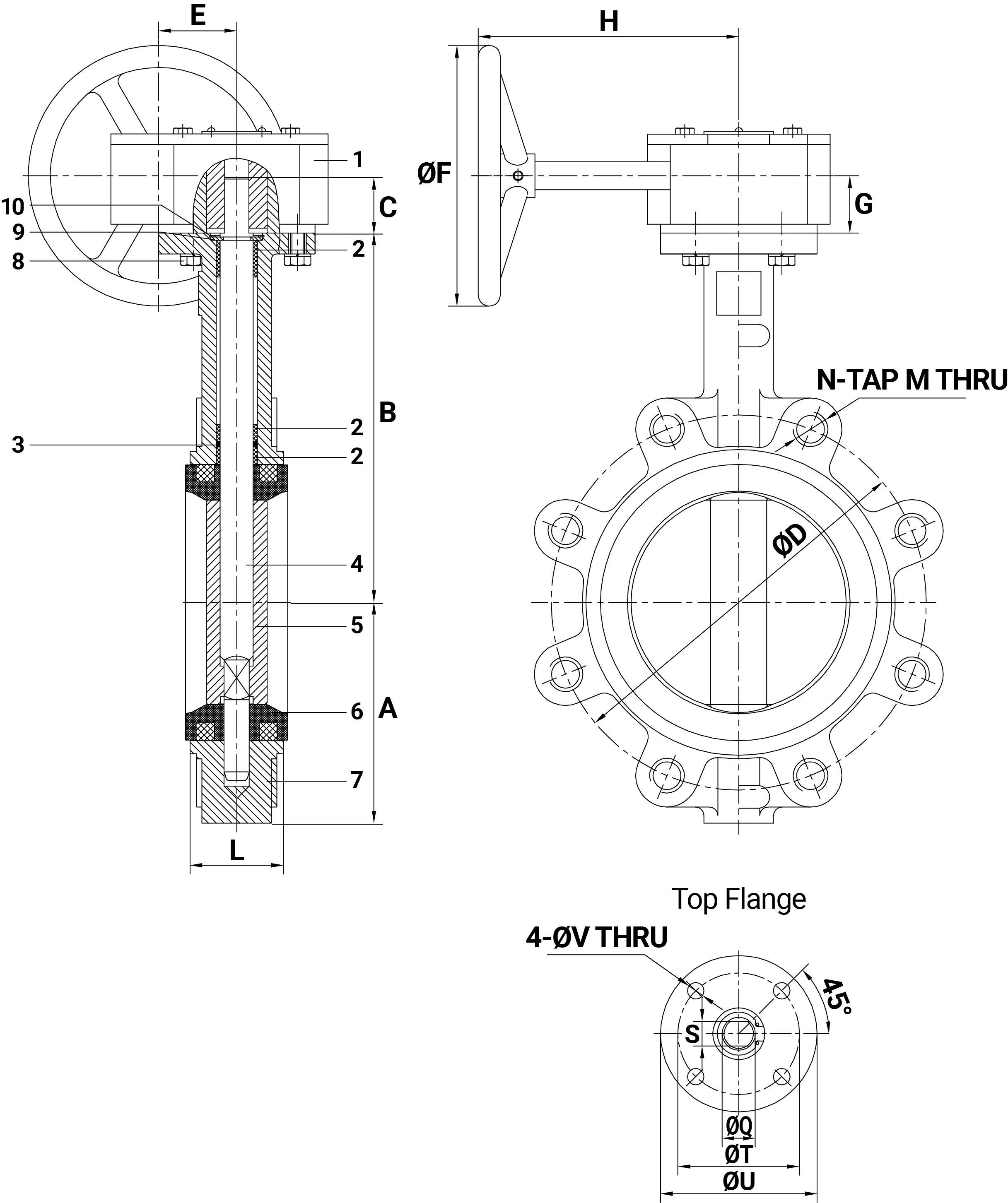 | Size | A | B | C | ⌀D | M | N | L | P | ⌀Q | S | ⌀T | ⌀U | ⌀V |